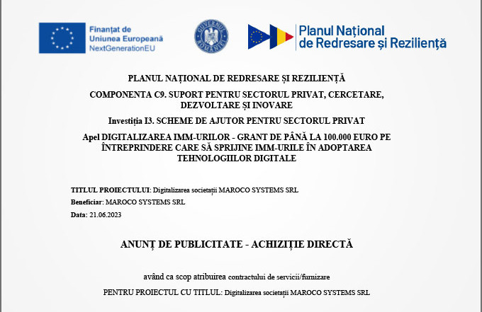 ANUNȚ DE PUBLICITATE - ACHIZIȚIE DIRECTĂ având ca scop atribuirea contractului de servicii/furnizare pentru proiectul Digitalizarea societații MAROCO SYSTEMS SRL PLANUL NAȚIONAL DE [...]